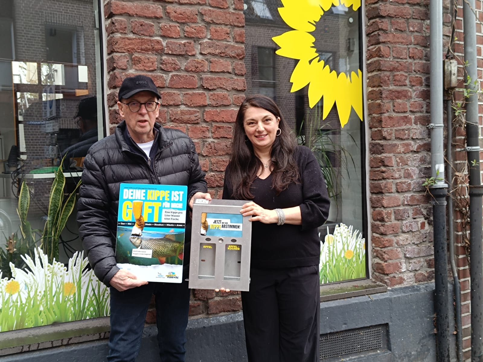 Mit unserem Kippen Barometer sammeln wir in Willich sehr erfolgreich Kippen. In einem Jahr mit 8 Barometern über 10000 Zigarettenstummel- und das auf lustige Weise! Der Raucher stimmt mit seiner Kippe ab. Pils oder Alt, Döner oder Pizza, vor einer Kita Eis oder Kuchen. Das sind nur einige Möglichkeiten den Raucher abstimmen zu lassen. Heute brachten wir Frau Meral Thoms nach Tönisvorst, in Ihr Büro, eines unserer Barometer.